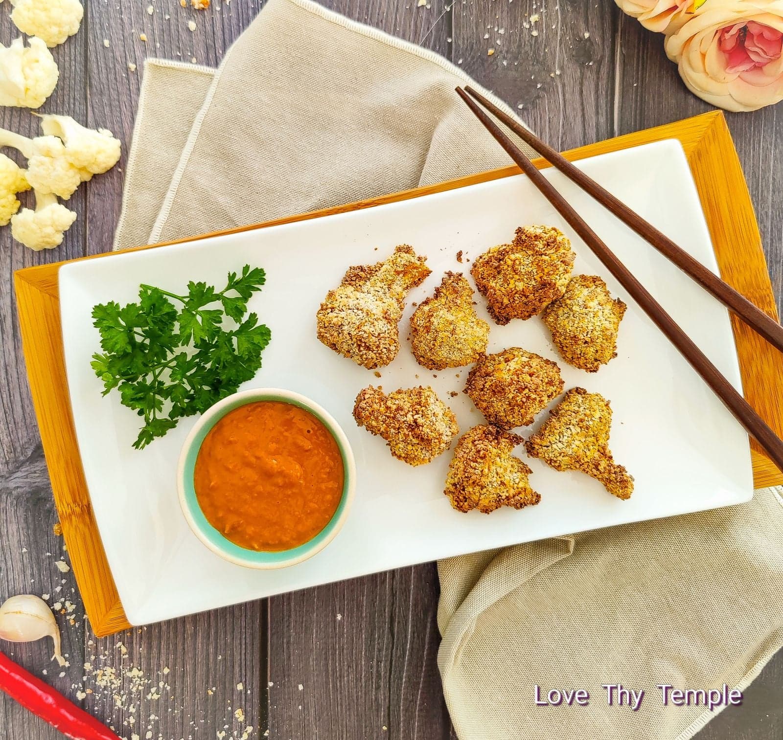 Crispy oven baked ???? ?????? ????? ??????????? ????? with a spicy peanut dipping sauce.